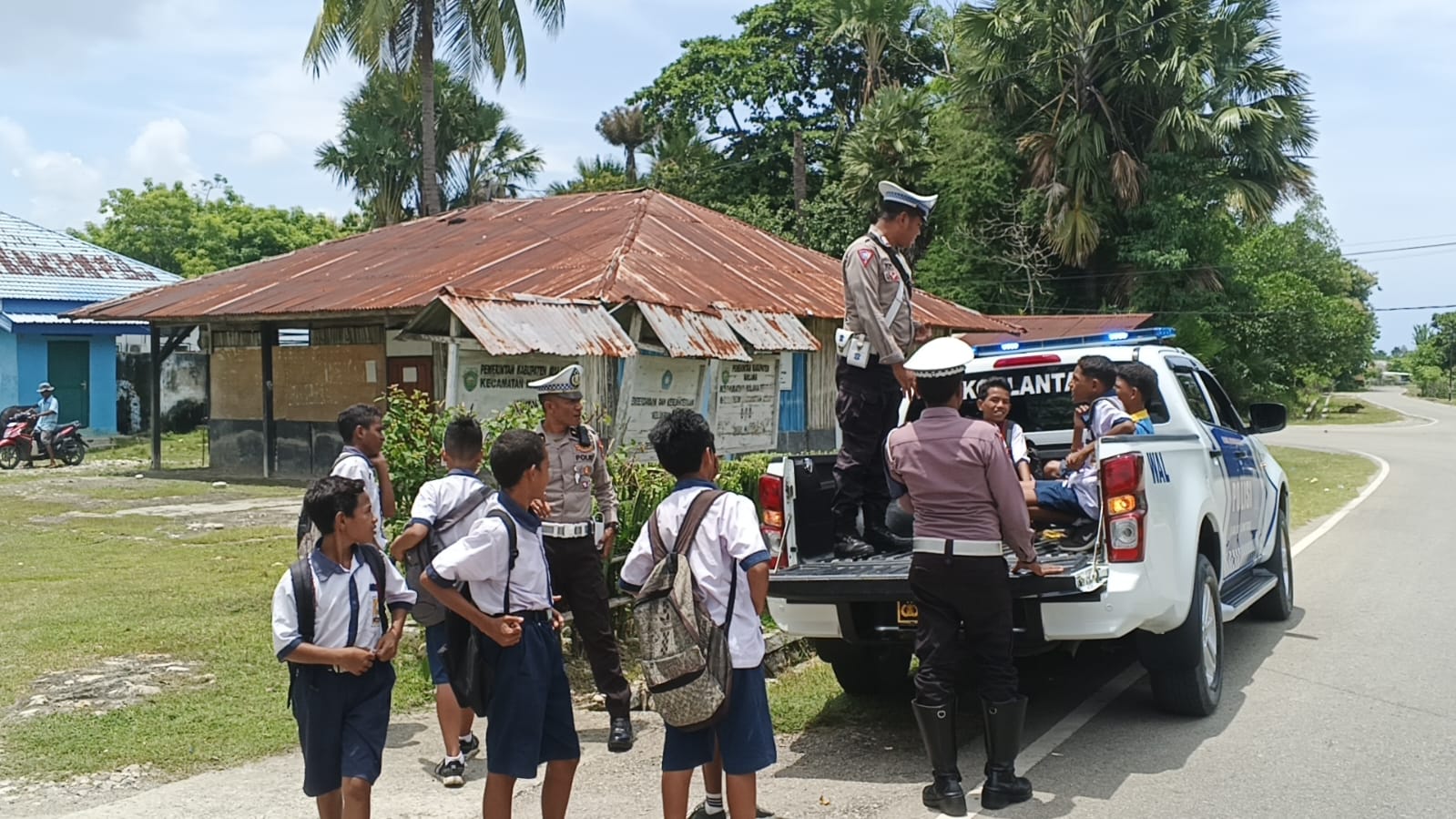 Untuk keselamatan para pelajar, Anggota Satuan Lalu Lintas Polres Malaka, Polda NTT mengantar Siswa – Siswi Sekolah dengan mobil Dinas Patroli saat hendak kembali ke rumah.