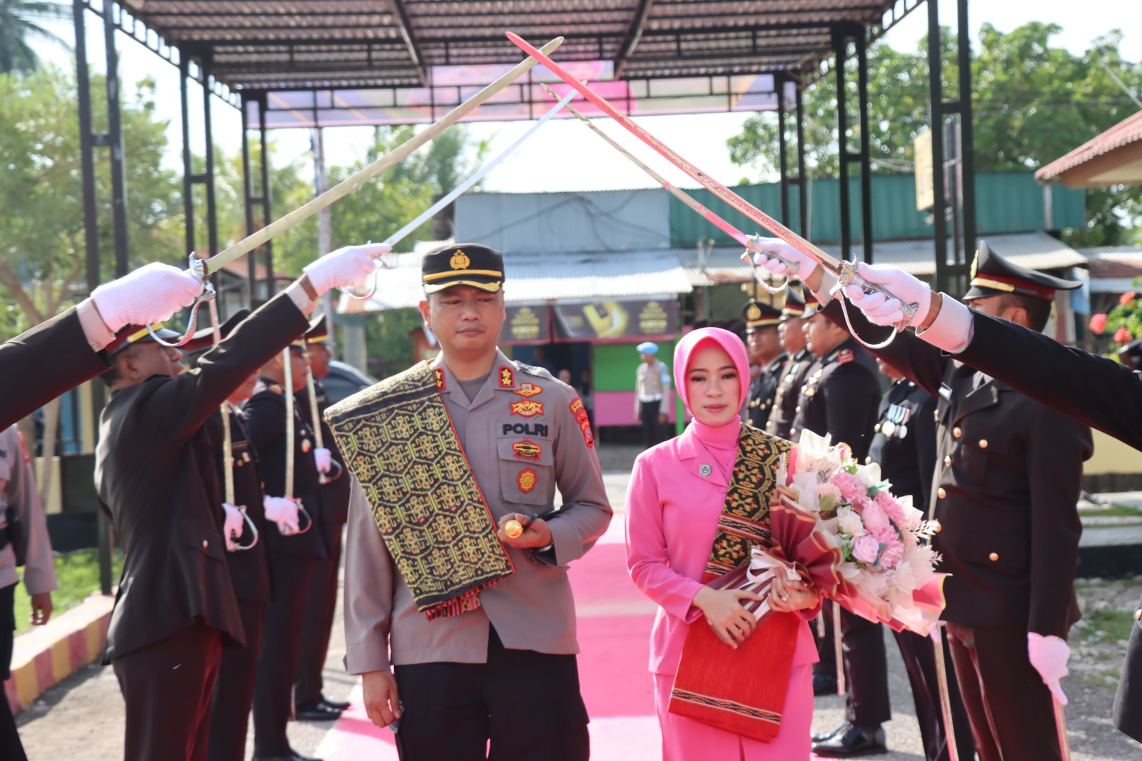Prosesi ini dilakukan oleh para perwira yang berbaris dengan pedang terhunus membentuk gapura, menciptakan suasana penuh kehormatan saat Kapolres melangkah memasuki gedung markas kepolisian.
